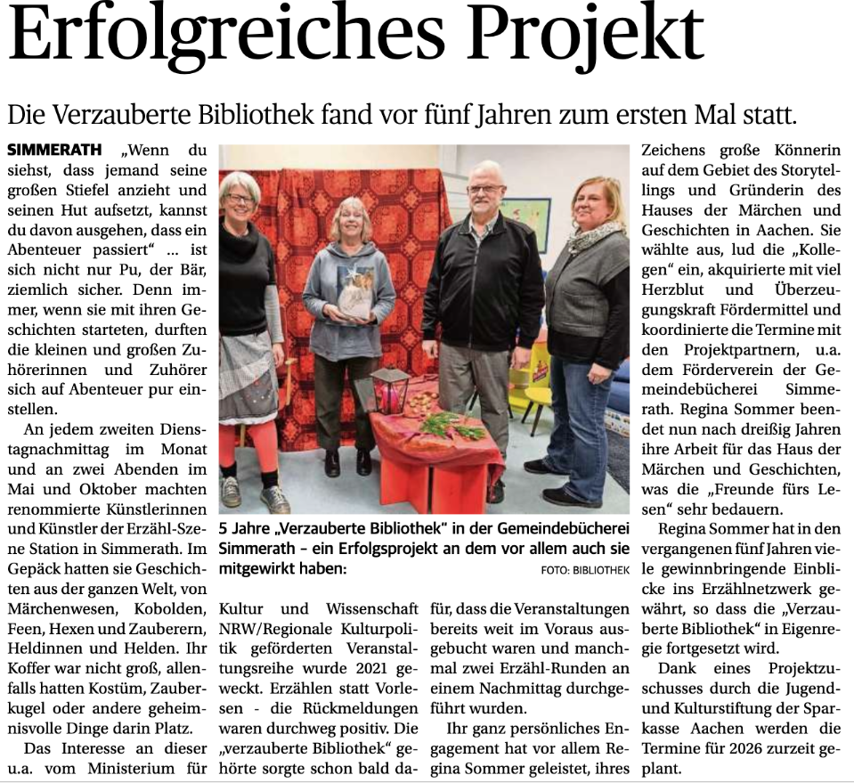 Die Verzauberte Bibliothek Simmerath ist groß geworden und wird ab 2026 selbstständig von der Gemeinedebibliothek Simmerath und dem Förderverein Freunde fürs Lesen e.V. weitergeführt. Wir freuen uns sehr, dass das Projekt Wurzeln geschlagen hat und in Simmerath weiter blüht und grünt!